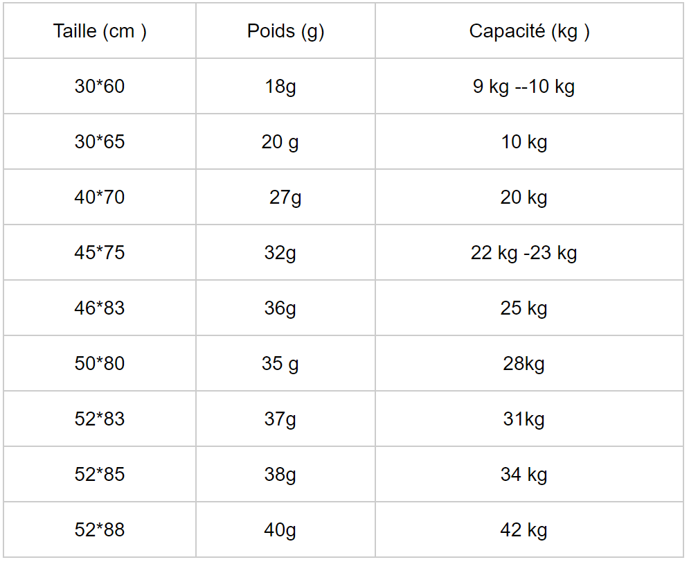 Tableau de comparaison des tailles et des charges